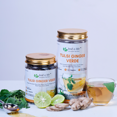 Elevate your tea ritual with Tulsi Ginger Verde, a vibrant blend of green tea, Rama and Krishna Tulsi, dry ginger, and lemon peel, sweetened naturally with stevia. This Tulsi Ginger Green Tea for Digestion is a carefully curated brew that harmonizes digestion, calms the mind, and supports cardiovascular wellness.